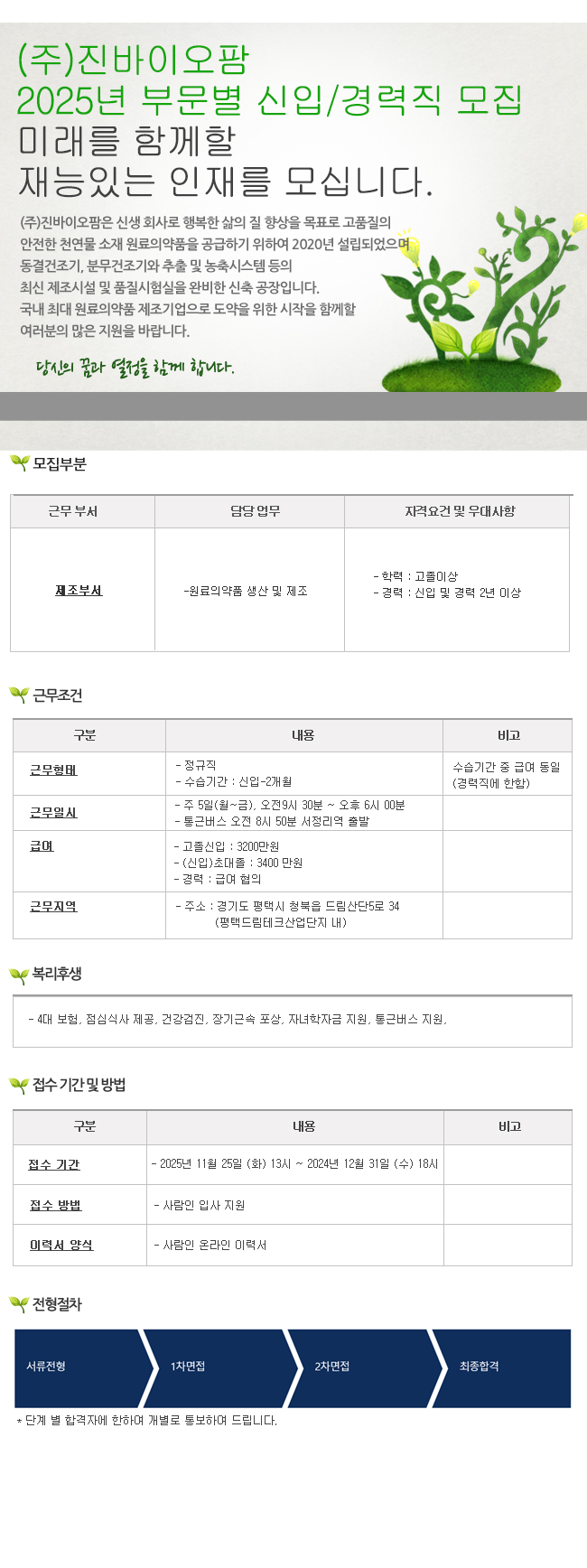제조부서 [(주)진바이오팜] 2025년 제조부서 신입/경력직 모집 이벤트 설명 이벤트 기간 2025-11-25 ~ 2025-12-31 페이지 정보 작성자 관리자 댓글 0건 조회 4회 작성일 25-11-25 14:00 목록 본문 .